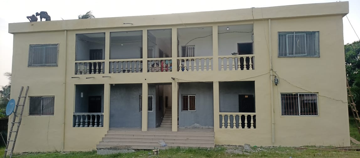 A huge beautiful unfinished modern single-family house nestled in the Broom Camp community in Brewerville.  It has 3 bedrooms, 2 baths, spacious living and dining rooms with a modern layout kitchen.  The front and back porches provide a wonderful view of the neighborhood. The compound has its own well.